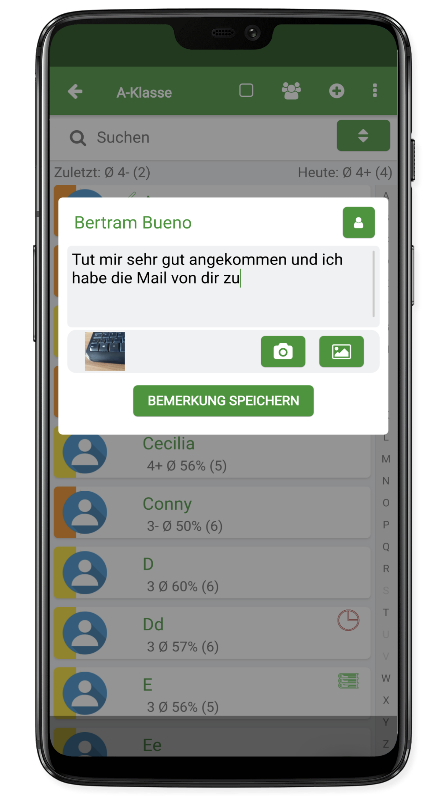 Man kann Bilder zum Unterrichtsverlauf (z.B. der Tafelanschrieb) und bei den Bemerkungen zu einem Schüler machen. Die Bilder können auch aus der Galerie in die App geladen werden. Jedes Bild braucht auch einen Text. Ohne Bemerkung wird das Bild nicht gespeichert. Es sind maximal 4000 Bilder möglich. Sie werden auf die Größe von 1 MB heruntergerechnet, so dass sich ein maximaler Speicherbedarf von 4 GB ergibt.