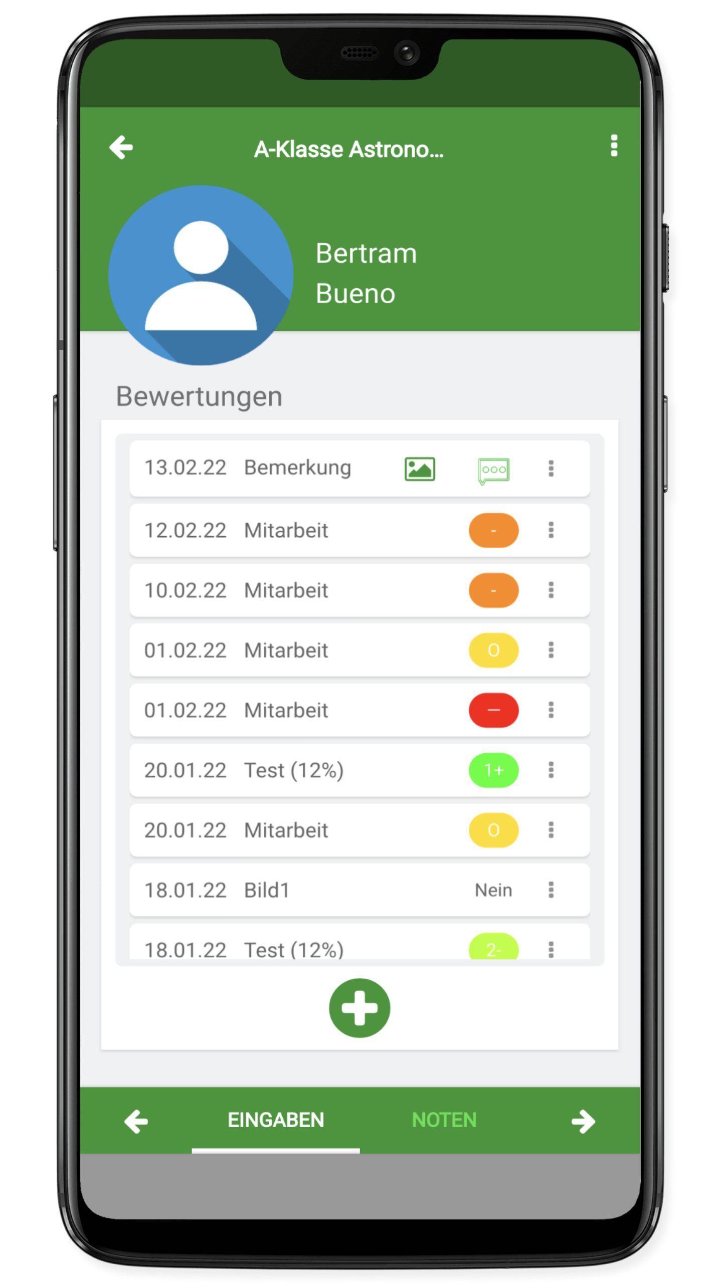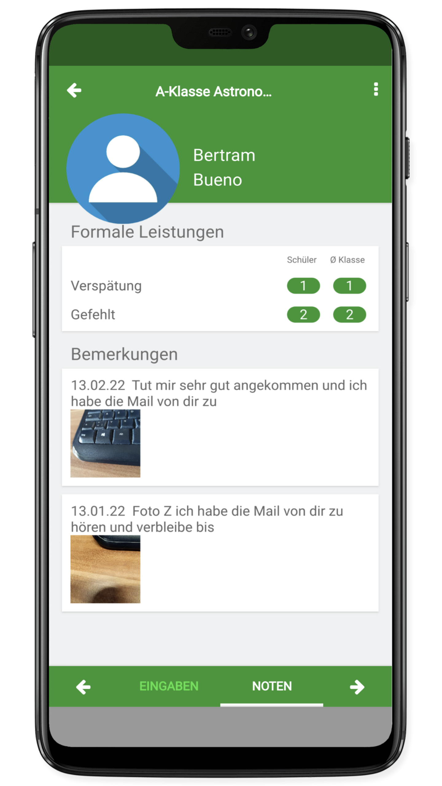 Anzeige bei den Noten des Schülers