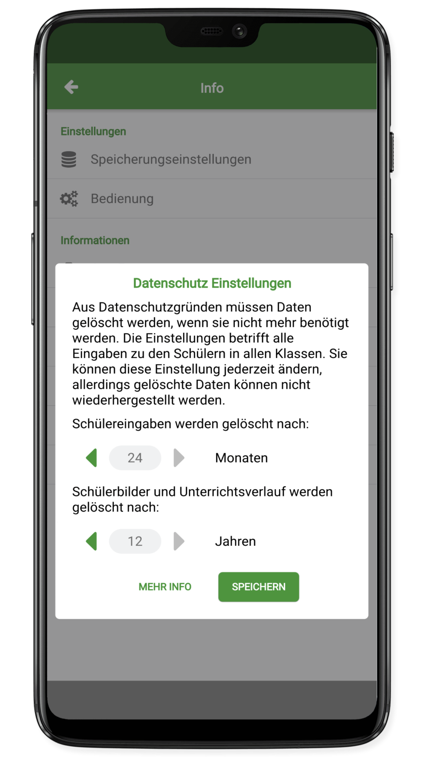 Auf der Info Seite finden sich die Einstellungen für das gesamte Programm. Sie gelten für alle Klassen. Unter dem Menuepunkt "Speichereinstellungen" findet man das dargestellte Fenster. Die höchste Speicherdauer für Schülerdaten sind 24 Monate.