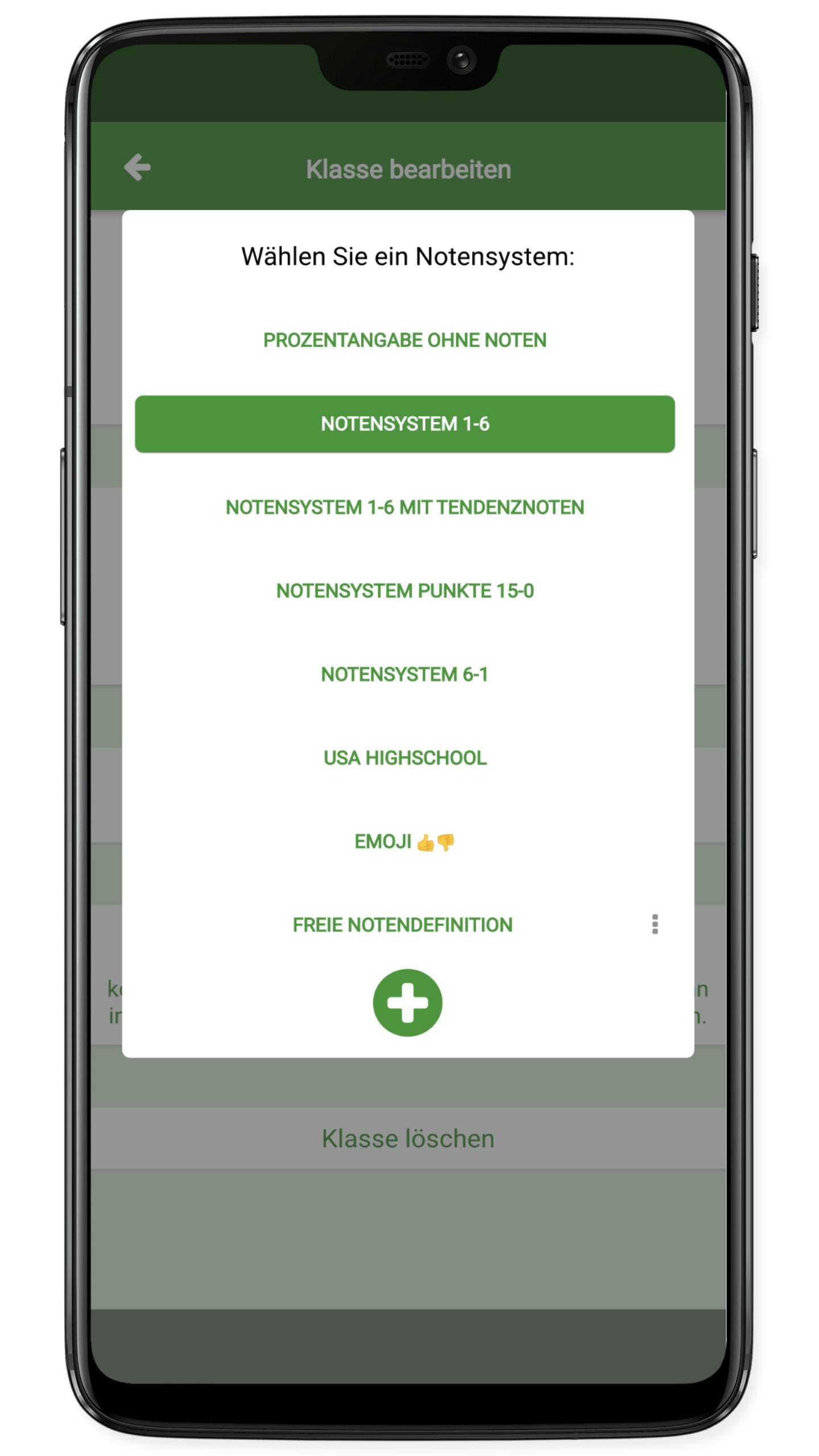 Als Standard bei der Installation kein Notensystem festgelegt. Angezeigt werden die Prozentangaben der Leistung. Hier dargestellt ist das Auswahlfenster für die möglichen Notensysteme. Ein Klick auf das Plus ermöglicht die Erstellungen eines neuen Notensystems.
